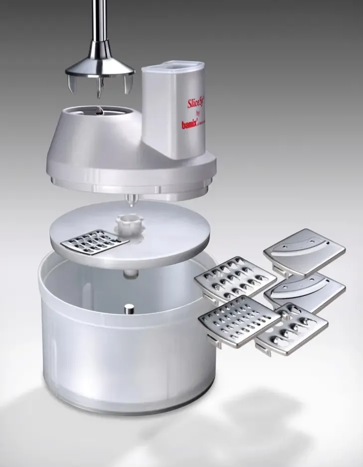Kaikkiin Bamix Sauvasekoitinmalleihin Sopiva Slice Sy -Viipalointi Ja – Raastinlaite Tekee Sauvasekoittimesta Minikokoisen Monitoimikoneen. Lisälaite On Helppo Ja Nopea Liittää Bamix-Sauvasekoittimen Jatkoksi, Kun Tarvitset Pikaisesti Esimerkiksi Juustoraastetta, Suikaloitua Porkkanaa Tai Siistejä Tasapaksuja Kurkkuviipaleita. Pieneentilaan Mahtuva Slice Sy On Helppo Pitää Vaikka Koko Ajan Käden Ulottuvilla. 5 Vaihdettavaa Raastin-/Viipalointiterää Ja Silppuriterä