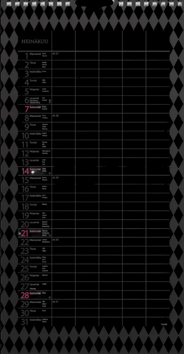 12 Sivua. Moderni Suunnitelmakalenteri Viidellä Sarakkeella. Kätevä Paperitasku Tärkeille Papereille Ja Kynänpidike. Kalenteri Sisältää Nimipäivät, Liputuspäivät, Kansalliset Pyhäpäivät Ja Kuun Vaiheet. Suomenkielinen. Parikierresidottu. Fsc®. Koko: 220X430 Mm (Ilman Paperitaskua).