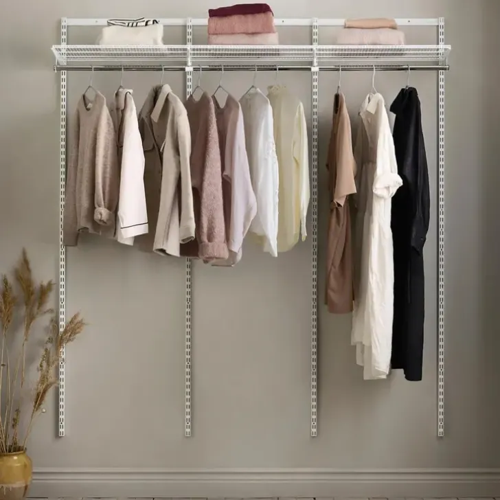 Erityisesti Vaatesailytykseen Soveltuva Elfa Aloituspakkaus Sisaltaa Kantokiskon, Riippukiskot, Lankahyllyn Ja Vaatetangon. Helppo Laajentaa Myohemmin Yhdistamalla Muita Elfan Sailytystuotteita.