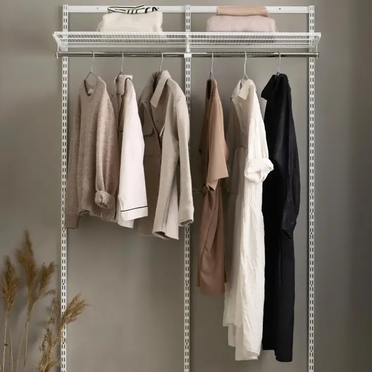 Erityisesti Vaatesailytykseen Soveltuva Elfa Aloituspakkaus Sisaltaa Kantokiskon, Riippukiskot, Lankahyllyn Ja Vaatetangon. Helppo Laajentaa Myohemmin