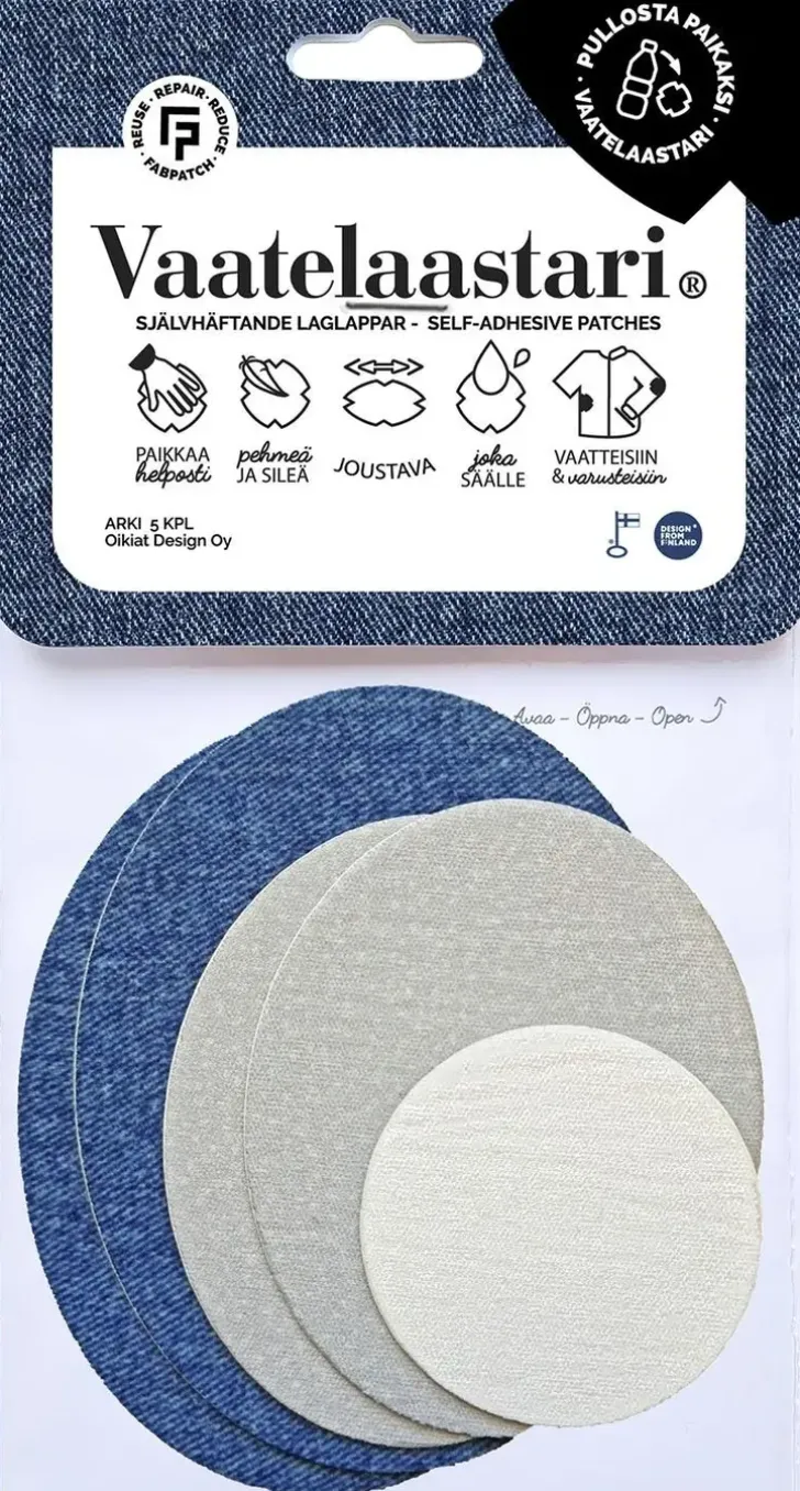 Fabpatch Vaatelaastari On Helppo Hankaamalla Kiinnittyvä Suomessa Valmistettu Tekstiilien Korjauspaikka. Tekstiilimateriaali On 100% Kierrätyspolyesteriä. Valmiiksi Muotoon Leikatut Paikat Ovat Kooltaan: 2 X Maxi 80X100Mm 2 X Medi 65X80Mm 1 X Mini 50Mm