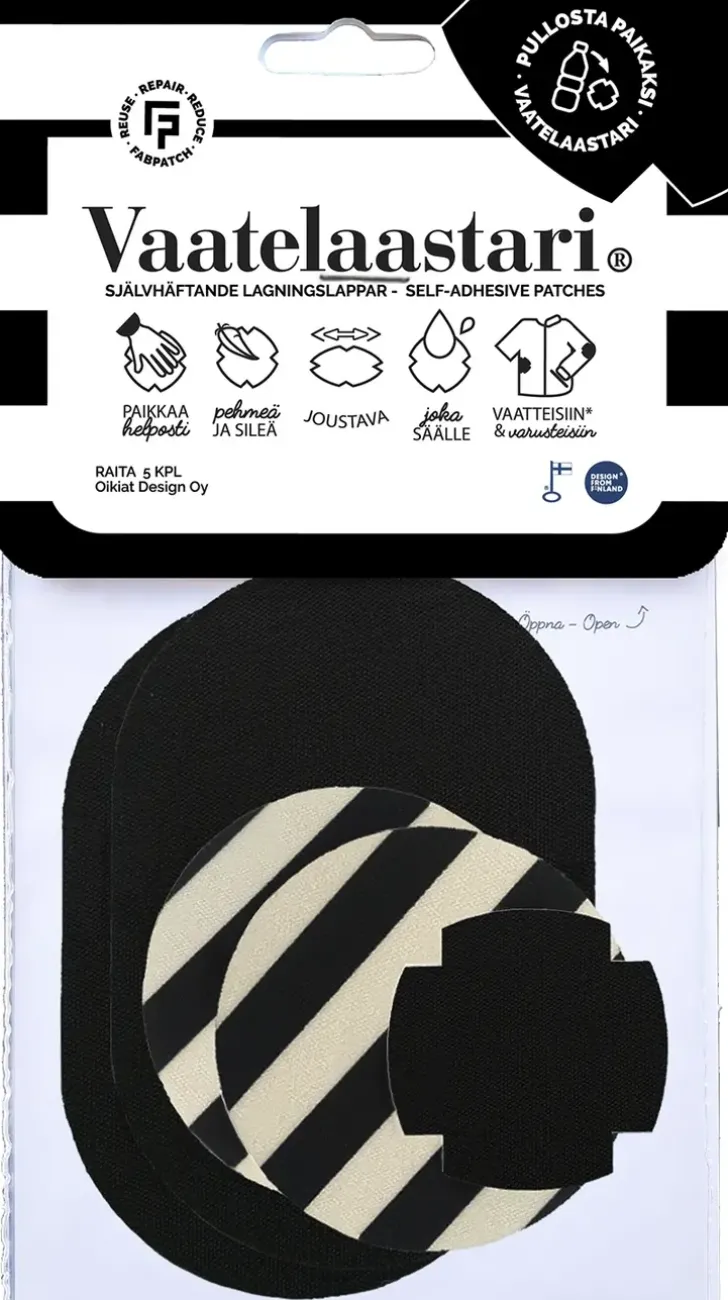 Fabpatch Vaatelaastari On Helppo Hankaamalla Kiinnittyvä Suomessa Valmistettu Tekstiilien Korjauspaikka. Tekstiilimateriaali On 100% Kierrätyspolyesteriä. Valmiiksi Muotoon Leikatut Paikat Ovat Kooltaan: 2 X Maxi 75X110Mm, 2 X Medi 65Mm, 1 X Mini 45X45Mm