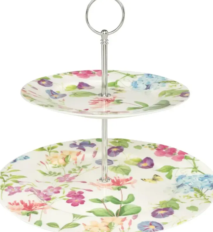 Kaunis Kaksikerroksinen Kakkuvati Posliinia. Tarjoiluvadeissa Kaunis Kukkakuvio. Lautasten Halkaisijat 19,5 Cm Ja 27,5 Cm. Käsinpesu.