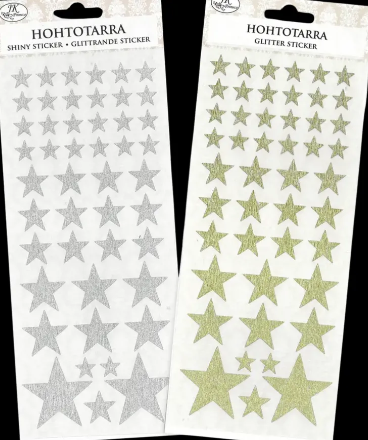 Hohtotarrat Askarteluun Ja Koristeluun. Pakkaus Sisältää Yhden Arkin Muovisia Tarroja, Joissa On Hohtava Pinta. Arkin Koko On N. 23Cm X 10Cm.