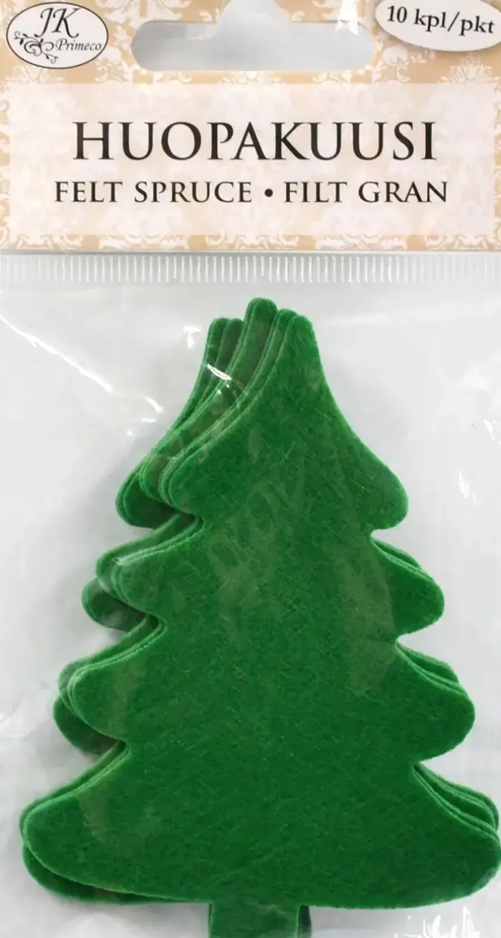 Huopakuuset Askarteluun Ja Koristeluun. Pakkaus Sisältää 10 Kappaletta Huovasta Valmistettuja Kuusia. Yhden Kuusen Koko On Noin 8Cm X 6Cm.