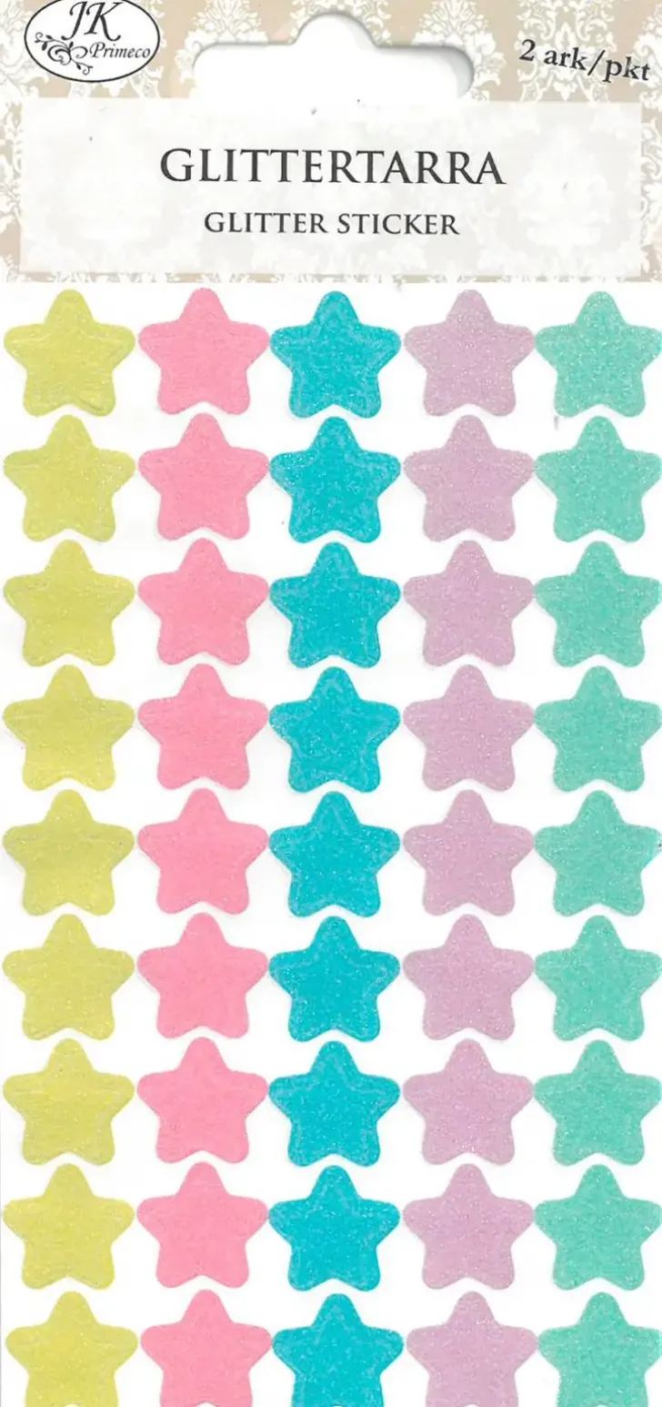 Kimalletarrat Askarteluun Ja Koristeluun. Pakkaus Sisältää Kaksi Arkkia Tähden Muotoisia Paperisia Kimalletarroja Viidessä Eri Värissä, Yhteensä 45 Tarraa. Yhden Tarran Halkaisija On N. 1,4Cm.