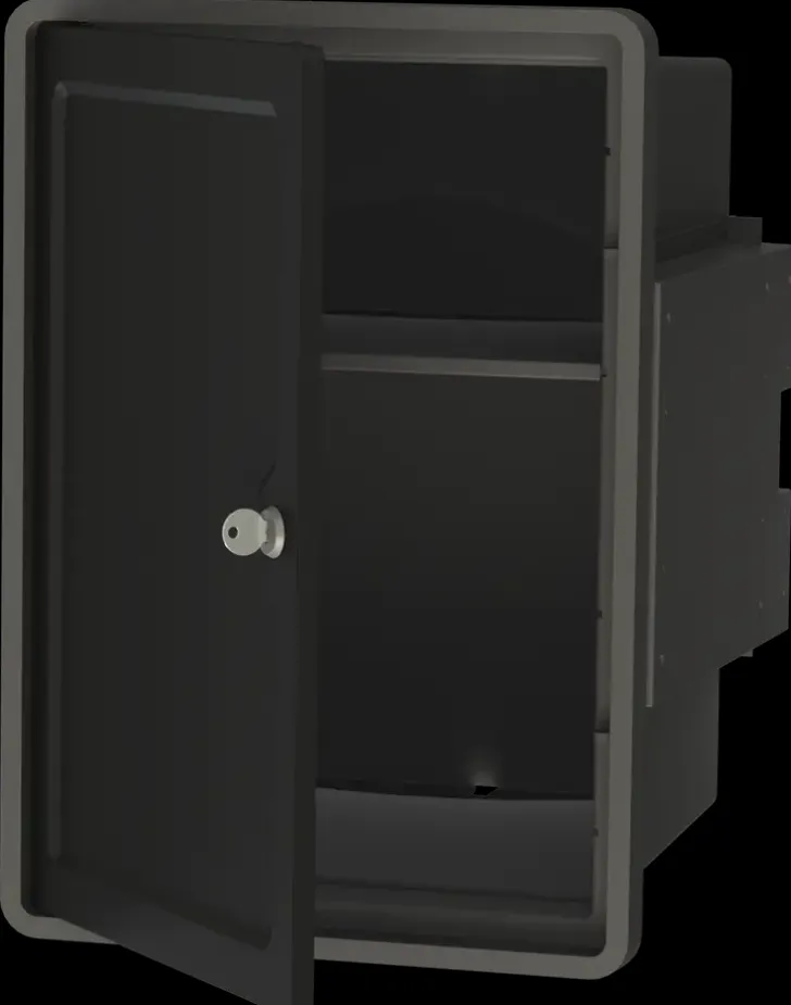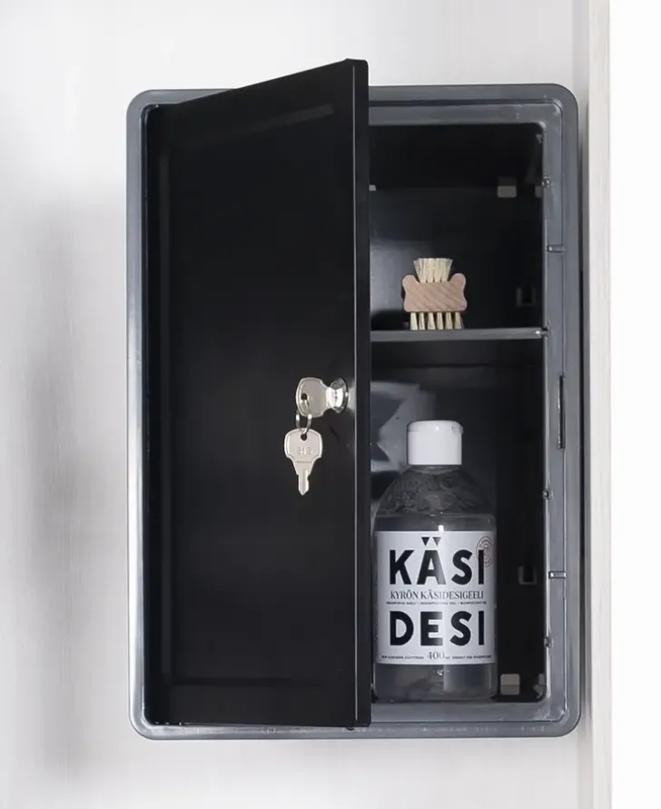 Lukittava Kaappi Soveltuu Mm. Kodin Lääkkeiden Ja Kemikaalien Turvalliseen Säilytykseen. Väri Musta/Antrasiitti. Lukittava Kaappi Kiinnitetään Ruuveilla Joko Pysty- Tai Vaaka-Asentoon. Kaappi On Abs-Muovia. Valmistettu Suomessa.