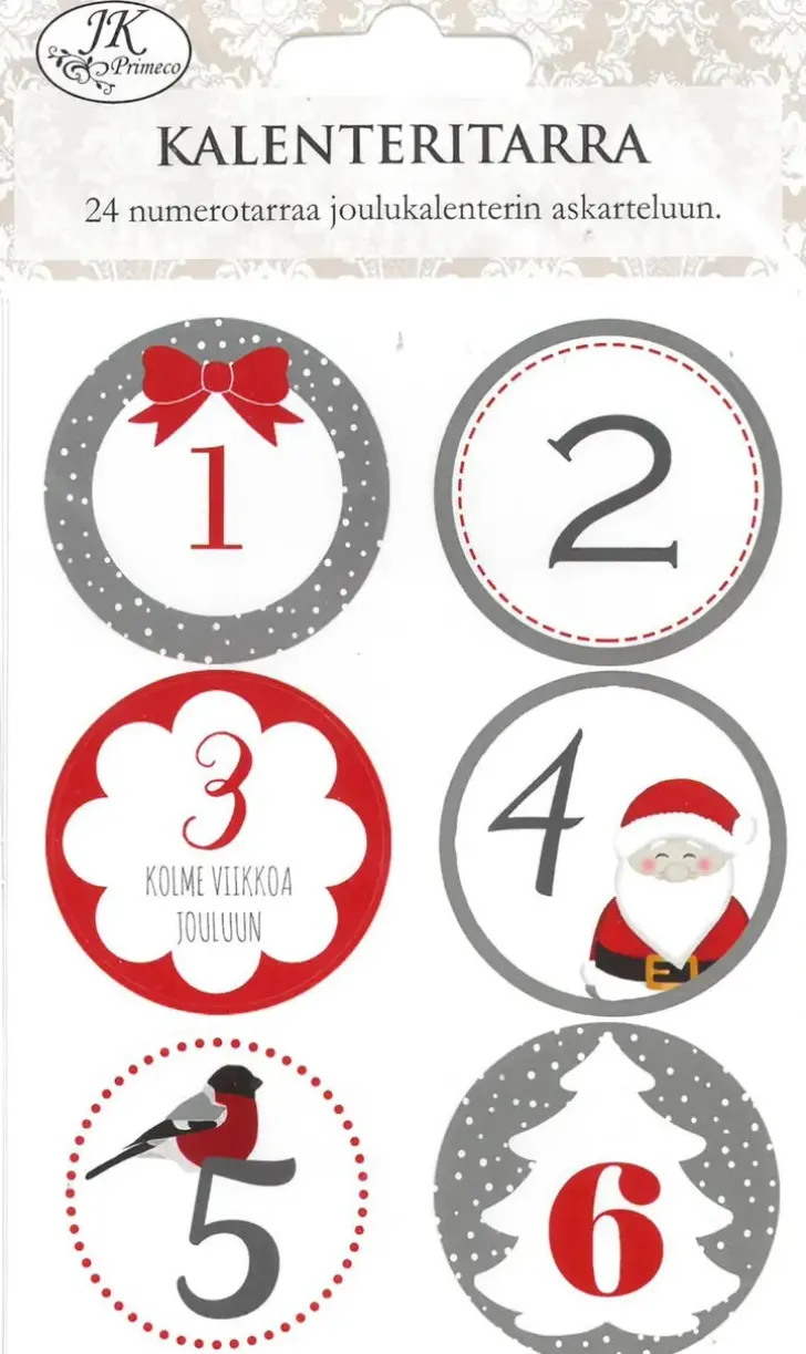 Joulukalenteritarra Joulukalenterin Askarteluun. Pakkauksessa Numerotarrat 1-24. 4 Arkkia/Pkt.