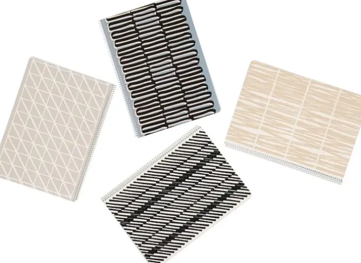 Laadukas Kotimainen Vallila Kierrevihko A4, 80 Sivua 7X7 Mm Ruuduilla. Neljä Tyylikästä Kuosivaihtoehtoa Lajitelmana. Kartonkikannet. Tuotteella On Avainlippu Ja Joutsenmerkki. Kuosit: Heinikko Beige, Puro Sininen, Tove Musta, Lucida Harmaa