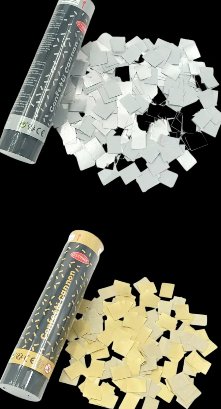 Konfettitykki Sisältää Neliönmuotoista Metallinhohtoista Paperikonfettia N. 4-5 Grammaa. Vaihtoehtona Konfettitykki Kullan- Tai Hopeanvärisellä Konfetilla.