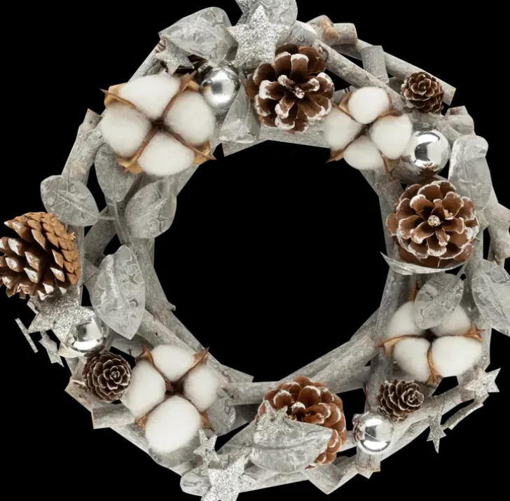 Kaunis Kranssi Oveen Tai Seinälle. Koristeena Käpyjä, Hopeanhohtoisia Lehtiä Ja Puuvillatuppoja. Halkaisija 30 Cm. Vain Koristekäyttöön.