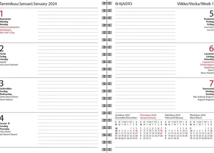 Kätevän Kokoinen, Suuri Pieni Kalenteri, Kulkee Helposti Mukana. Koko 130 X 185 Mm; Leatherette-Kannet; Parikierresidottu; Kielisyys: Suomi, Ruotsi, Englanti; Yleiskalendaario 2024; Vuosisuunnitelmat 2024 Ja 2025; Päiväkirja 50/2023–1/2025; Viikko Aukeamalla, Päivät Vaakasuunnassa; Joka Kuukauden Jälkeen Muistiinpanoaukeama; Liputuspäivät Suomessa; Kansalliset Vapaapäivät Taulukkona; Suomalaiset Ja Suomenruotsalaiset Nimipäivät; Runsaasti Muistiinpanosivuja; Viikkosuunnitelmasivuja; Kynänpidike; Fsc®-Sertifioitu Tuote.