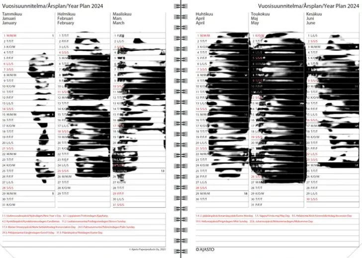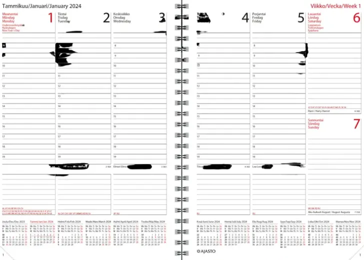 Tehokas Ja Loistelias Kalenteri Päivittäiseen Käyttöön. Koko 148 X 210 Mm (A5); Parikierresidottu; Leatherette-Kannet; Kielisyys: Suomi, Ruotsi, Englanti; 2024 Yleiskalendaario; Päiväkirja 52/2023–1/2025; Vuosisuunnitelmat 2024 Ja 2025; Kansalliset Vapaapäivät; Suomalaiset Ja Suomenruotsalaiset Nimipäivät; Auringon Nousu- Ja Laskuajat (Helsinki, Oulu); Kansainvälinen Aika; Runsaasti Muistiinpanotilaa; Kynä Ja Kynänpidike; Fsc®-Sertifioitu Tuote.