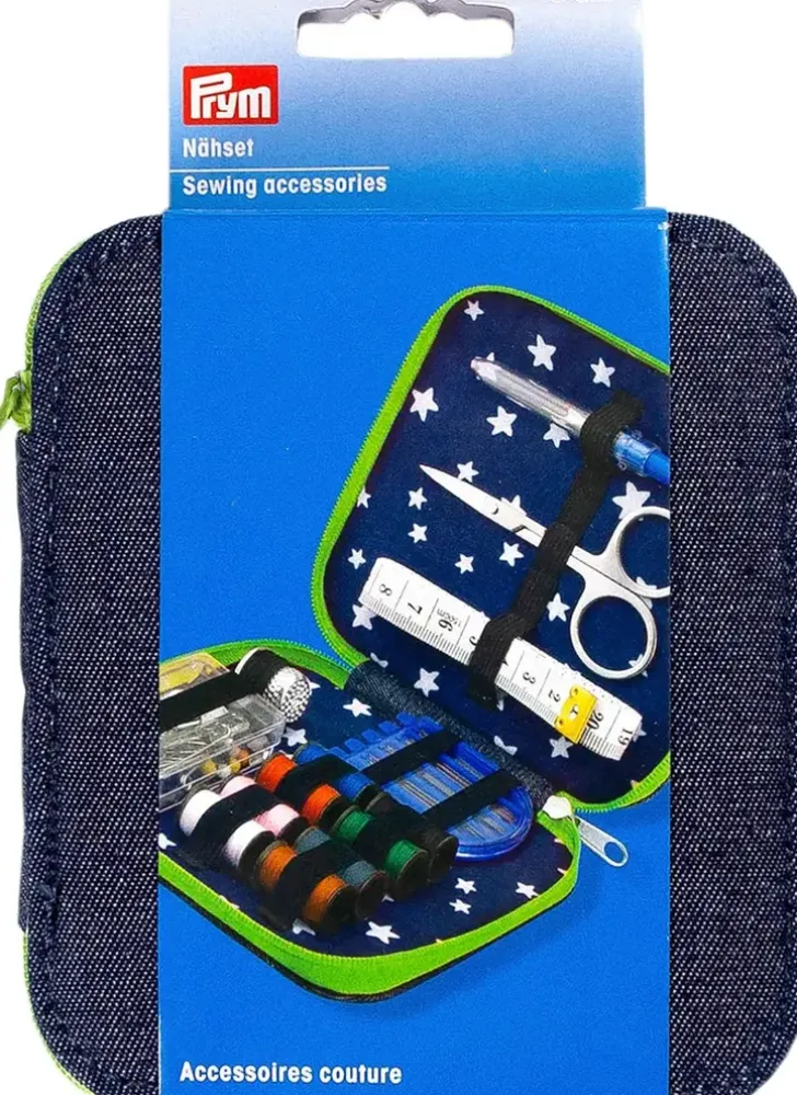 Farkkukankainen Matkapakkaus Kotiin Ja Matkalle. Sisältää Neppareita, Nappeja, Silmäneuloja, Lankaa, Nuppineuloja, Langanpujotin, Hakaneuloja, Sormustin, Sakset, Mittanauha Ja Ratkoja.