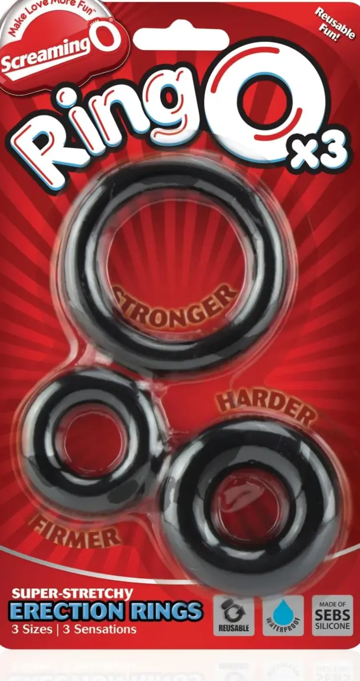 The Screaming O Penisrengaspaketti Sisältää Kolme Eri Kokoista Ja Eri Vahvuista Penisrengasta. Silikonista Ja Tpe: Stä Valmistettu Penisrengas Puristaa Peniksen Juuresta Tehden Erektiosta Voimakkaamman Ja Pitkäkestoisemman. Renkaat Ovat Joustavat Ja Niiden Käyttäminen On Helppoa. Renkaita Voi Halutessaan Käyttää Myös Useampaa Kerralla. Käytä Penisrenkaiden Kanssa Ainoastaan Vesipohjaista Liukuvoidetta. Kokotietoja: Renkaiden Halkaisijat Lepotilassa 3,5 Cm, 4,5 Cm, 5,5 Cmfipuhdistus: Pese Laimealla Saippuavedellä Ja Anna Tuotteen Kuivua Itsekseen Tai Taputtele Tuote Kuivaksi Pyyhkeellä. Desinfioi Tarvittaessa Seksivälineille Tarkoitetulla Desinfiointi- /Puhdistusaineella.Säilytys: Erilaiset Materiaalit Voivat Reagoida Keskenään, Siksi Seksivälineet Kannattaa Säilyttää Toisistaan Erillään. Säilytä Huoneenlämmössä Suojattuna Pölyltä Ja Auringonvalolta Sekä Mahdollisimman Viileässä Ja Kuivassa Paikassa. Säilytä Lasten Ulottumattomissa.Käyttö: Käytä Silikonista Valmistetuille Tuotteille Vesipohjaista Liukuvoidetta.Silikonipohjainen Liukuvoide Ei Sovellu Käytettäväksi Silikonista Valmistettujen Seksivälineiden Kanssa. Silikonipohjaisen Liukasteen Ja Silikonista Valmistetun Seksivälineen Hankautuessa Keskenään, Silikonimateriaalin Pinta Saattaa Haurastua Muuttuen Epähygieeniseksi Ja Käyttökelvottomaksi.Materiaali: Silikoni, Tpeserengöring: Rengör Med Milt Såpvatten. Låt Produkten Torka Av Sig Själv Eller Klappa Den Torr Med En Handduk. Desinficera Vid Behov Med Ett Desinficerings-/Rengöringsmedel Avsett För Sexhjälpmedel.Förvaring: Olika Material Kan Reagera Sinsemellan Och Därför Ska Sexhjälpmedel Helst Förvaras Separat Från Varandra. Förvara I Rumstemperatur Skyddad Mot Damm Och Solljus Och På En Sval Och Torr Plats. Förvara Utom Räckhåll För Barn.Användning: Använd Vattenbaserat Glidmedel För Produkter Tillverkade Av Silikon.Silikonbaserat Glidmedel Bör Inte Användas Med Sexhjälpmedel Tillverkade Av Silikon. När Ett Silikonbaserat Glidmedel Och Ett Sexhjälpmedel Tillverkat Av Silikon Glider Mot Varandra Kan Ytan På Silikonmaterialet Bli Skörare, Vilket Gör Det Ohygieniskt Och Oanvändbart.Material: Silikon, Tpe