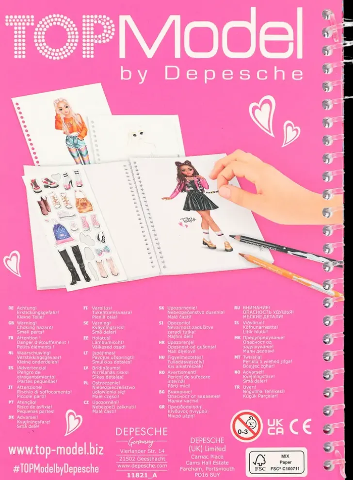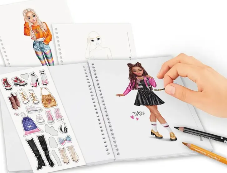 Topmodel Taskuvärityskirja Kulkee Kanssasi Kaikkialle Näppärän Kokonsa Ansiosta! Kirjan Sivuille Voit Suunnitella Upeita Asukokonaisuuksia Ja Luomuksesi Viimeistelet Mukana Tulevien Tarrojen Avulla!