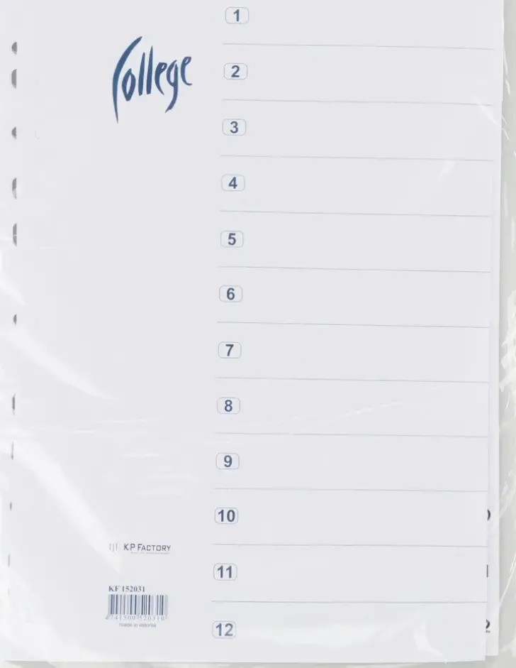Välilehti A4 Kokoisille Arkeille. Valkoiset Numeroidut Lehdet, 12-Jakoinen. Viivoitus Etulehdessä. Monireiitys, Joka Sopii Lähes Kaikkiin Mappeihin Ja Kansioihin. Välilehden Ulkomitat 225 X 298 Mm.