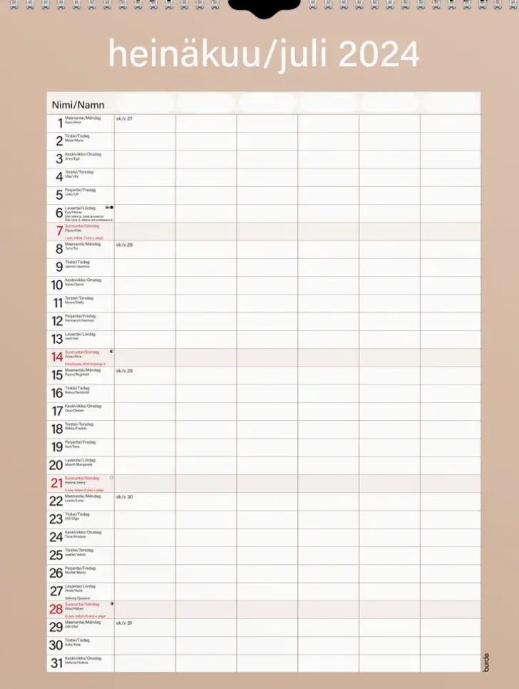 12 Sivua. Yksinkertainen Seinäkalenteri Koko Perheen Menoille. Kuudella Sarakkeella. Kalenteri Sisältää Nimipäivät, Liputuspäivät, Kansalliset Pyhäpäivät Ja Kuun Vaiheet. Kaksikielinen: Suomi/Ruotsi. Parikierresidottu. Fsc®. Koko: 295X390 Mm.