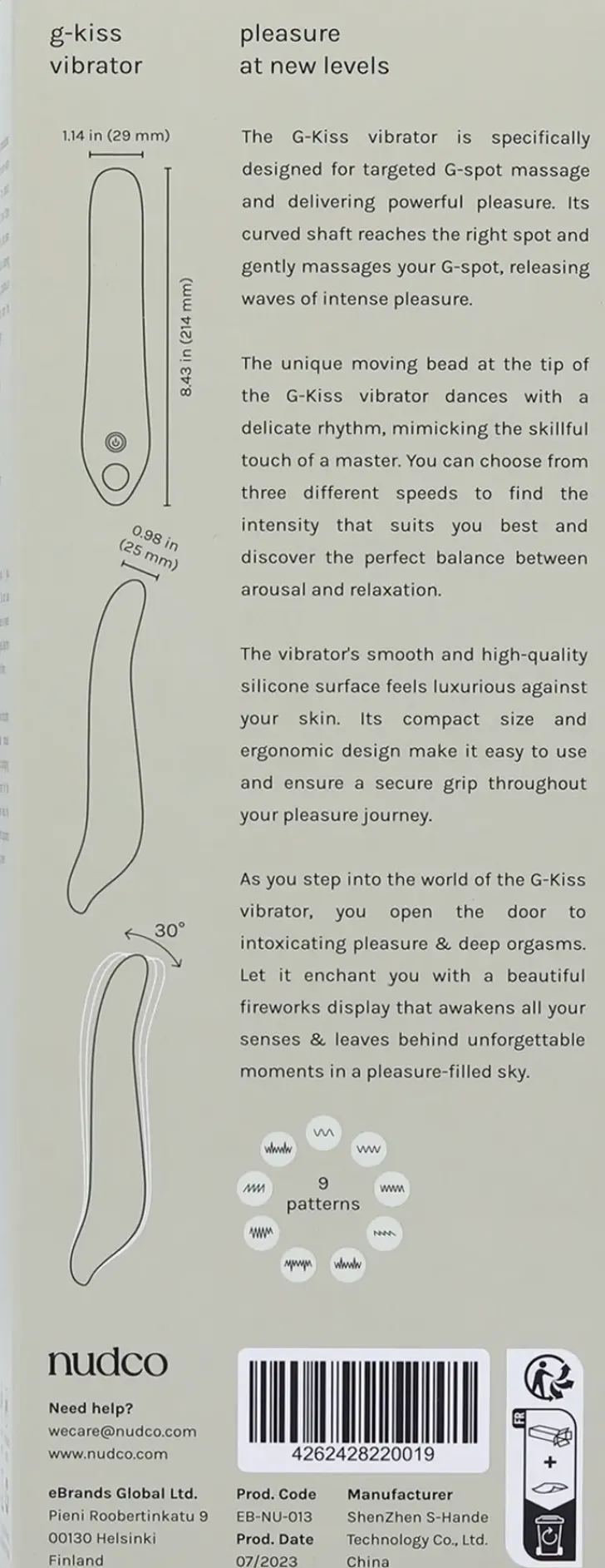 Hanki Täydellinen Nautinnon Lähde Ja Anna Itsesi Uppoutua Aistilliseen Ilotulitukseen G-Kiss Vibraattorin Kanssa. Tämä Elegantti G-Spot Vibraattori Vie Sinut Huipulle Ja Tarjoaa Unohtumattomia Hetkiä Täyteläisen Stimulaation Maailmassa.G-Kiss Vibraattori On Suunniteltu Erityisesti G-Pisteen Kohdennettuun Hierontaan Ja Voimakkaan Mielihyvän Tuottamiseen. Sen Kaareva Varsi Tavoittaa Juuri Oikean Paikan Ja Hellästi Hieroo G-Pistettäsi, Vapauttaen Aaltoja Intensiivistä Nautintoa.Ainutlaatuinen Liikkuva Kuula G-Kiss Vibraattorin Kärjessä Tanssii Herkällä Rytmillä, Jäljitellen Mestarillisen Kosketuksen Taitoa. Voit Valita Kolmesta Eri Nopeudesta Juuri Sinulle Sopivan Intensiteetin Ja Löytää Täydellisen Tasapainon Kiihottumisen Ja Rentoutumisen Välillä.Vibraattorin Sileä Ja Laadukas Silikonipinta Tuntuu Ylelliseltä Kosketukselta Ihollasi. Sen Kompakti Koko Ja Ergonominen Muotoilu Tekevät Siitä Helppokäyttöisen Ja Varmistavat, Että Se Pysyy Tukevasti Otteessasi Koko Nautinnon Matkan Ajan.G-Kiss Vibraattorin Akku Kestää Jopa 1,5 Tuntia Jatkuvaa Iloa Yhdellä Latauksella. Lataus On Vaivatonta Ja Nopeaa Mukana Toimitettavalla Latausjohdolla, Ja Täyteen Lataus Kestää Vain 2,5 Tuntia. Näin Voit Unohtaa Huolesi Akun Tyhjenemisestä Ja Keskittyä Täysin Omaan Nautintoon.Muista Aina Noudattaa Turvallisuusohjeita Ja Käyttöohjeita, Jotka Sisältyvät Tuotepakkaukseen. Käytä Aina Vesipohjaista Liukuvoidetta Parhaan Mahdollisen Liukkauden Saavuttamiseksi Ja Pidä Vibraattori Puhtaana Käyttäen Lempeää Saippuaa Ja Lämmintä Vettä Tai Seksilelun Puhdistusainetta.Astuessasi G-Kiss Vibraattorin Maailmaan, Avaat Oven Huumaavaan Nautintoon Ja Syviin Orgasmeihin. Anna Sen Viehättää Sinut Kauniiseen Ilotulitukseen, Joka Herättää Kaikki Aistisi Ja Jättää Jälkeensä Ikimuistoisia Hetkiä Nautinnon Täyttämässä Taivaassa.Tuotteen Puhdistaminen Ja Säilyttäminen: Puhdista Tuote Lämpimällä Vedellä Ja Miedolla Saippuavedellä. Kuivaa Tuote Huolellisesti Pehmeällä Pyyhkeellä. Säilytä Tuote Viileässä, Kuivassa Ja Puhtaassa Paikassa. Vältä Orgaanisten Puhdistusaineiden, Kuten Alkoholin, Bensiinin Tai Asetonin Käyttöä. Älä Myöskään Säilytä Tuotetta Suorassa Auringonvalossa.Tekniset Tiedot: Vesitiivis Materiaali: Silikoni Akun Kesto: 1,5 Tuntia Latausaika: 2,5 Tuntia Värinätiloja: 9Varoitus: Lopeta Laitteen Käyttö, Jos Tunnet Epämukavuutta. Älä Käytä Tuotetta, Jos Sen Pinta On Epätasainen Tai Tuote On Vaurioitunut. Pidä Tuote Poissa Lasten Ulottuvilta.