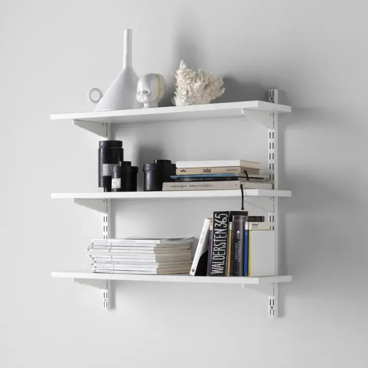 Hyva Valmisratkaisu, Joka Sisaltaa Kaiken Mita Tarvitset Kolmen Hyllyn Kirjahyllyn Luomiseen. Plug-In -Teknologian Ja Seinakiskojen Reikien Ansiosta Helppo Asentaa Oikein Vatupassia Kayttaen.