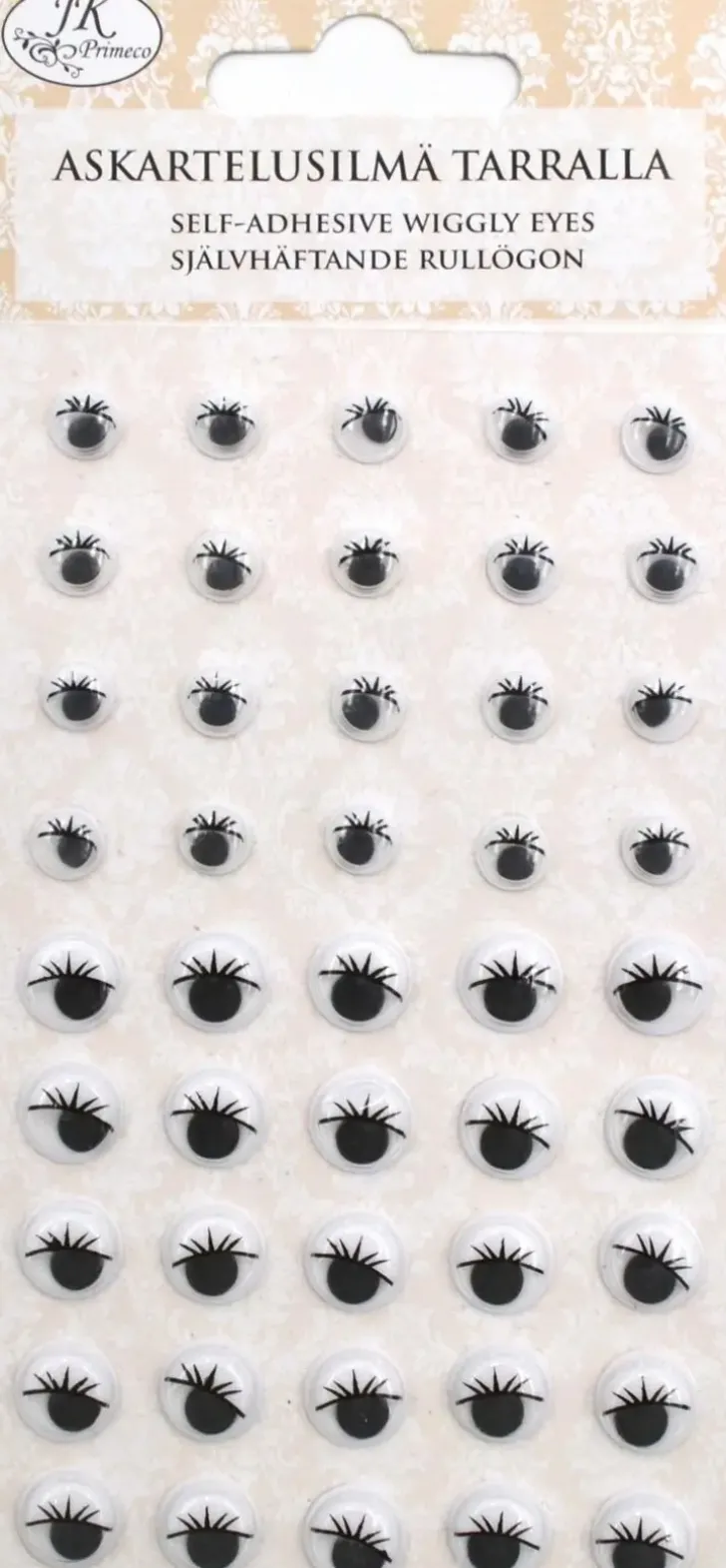 Askartelusilmät Tarralla Askarteluun Ja Koristeluun. Pakkaus Sisältää 45 Kappaletta Muovisia Askartelusilmätarroja, Joissa On Liikkuvat Pupillit. Silmien Halkaisijat Ovat N. 0,7Cm Ja 1Cm.