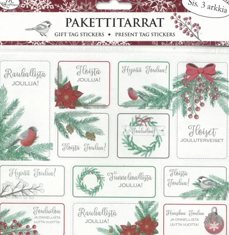 Pakettitarrat Lahjojen Paketointiin, Askarteluun Ja Koristeluun. Pakkaus Sisältää Kolme Samanlaista Arkkia Paperisia Tarroja, Joissa On Glitteriä. Yhden Arkin Koko On N. 16 X 20,3Cm.