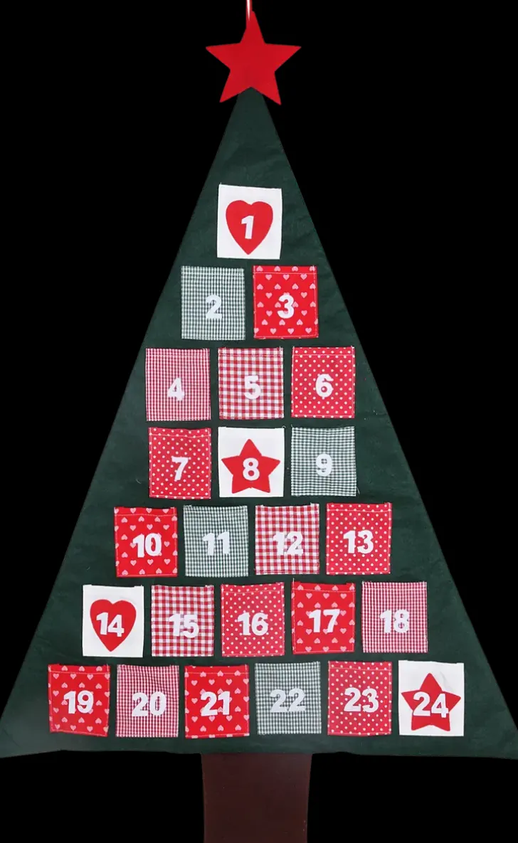 Täytettävä Pussukkakalenteri Kuusen Muodossa. Hauskat, Hieman Erikuosiset Pussukat Pieniä Kalenteriyllätyksiä Varten. Ripustetaan Seinälle Ripustuskoukun Avulla. Mitat 60 X 90 Cm.