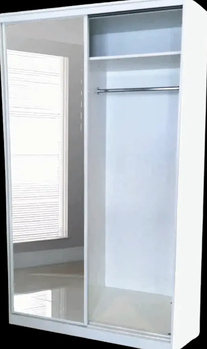 Kotimainen Laadukas Liukuovikomero Hyllyväliköllä Ja Vaatetankoväliköllä. Valkea Komero, Mitat L1200 X K2218 X S600Mm, Valmistettu 16Mm Valkoisesta Kalustelevystä. Sisältää 2 Kpl Peililiukuovea Liukukiskoineen, Sekä Asennushelat. Pakkaus Sisältää Kokoamisohjeen, Taustalevy Ostettavissa Erikseen.