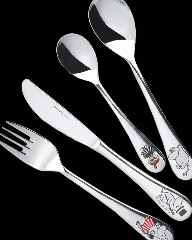 Muumi Perhe-Aterinsetti Sisältää Lasten Haarukan, Veitsen, Ruokalusikan Sekä Kahvilusikan. Aterinten Pituus N. 17 Cm, Kahvilusikan Pituus 13,4 Cm. Aterimissa 4 Eri Hahmoa: Muumimamma, Muumipappa, Muumipeikko Ja Pikku Myy. Ruostumatonta Terästä.