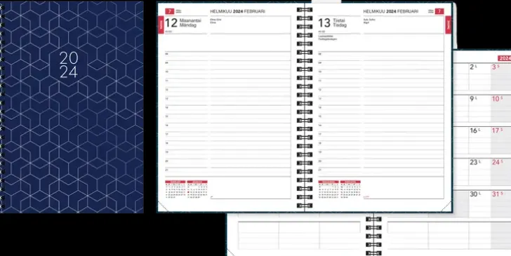 Kalenterin Koko On A5, Viikot 52/2023-52/2024, Vuosisuunnittelut 2024 Ja 2025. Kukin Päivä Omalla Sivullaan Ja Viikonloppu Yhdellä Sivulla. Runsaasti Päiväkohtaista Kirjoitustilaa. Joka Kuukauden Alussa Kätevä Suunnitelma-Aukeama Ja Sivujen Laidoissa Juokseva Kuukausimerkintä. Tunnit 8-20 Puolen Tunnin Jaolla, Liputuspäivät, Kansalliset Pyhät Sivuilla Ja Luettelona, Nimipäivät Ja Vuosikalenterit 2025-2028. Wiresidottu, Kulmaperforoitu. Siirrettävä Päiväosoitin. Kovat Kirjakannet. Kielisyys Suomi Ja Ruotsi.