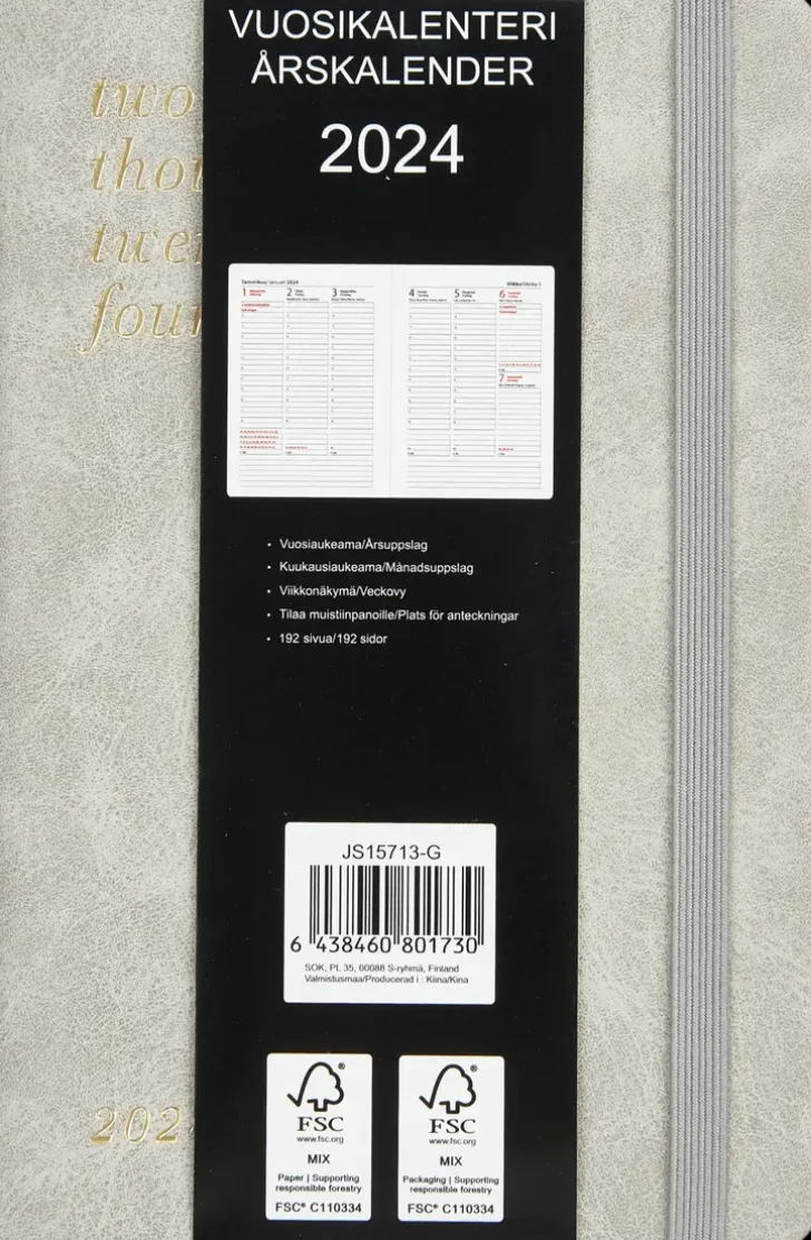 Taskukalenteri Kuminauhalla Ja Kirjanmerkkinauhalla. Koko: A6. Kielisyys: Suomi, Ruotsi. 192 Sivua.