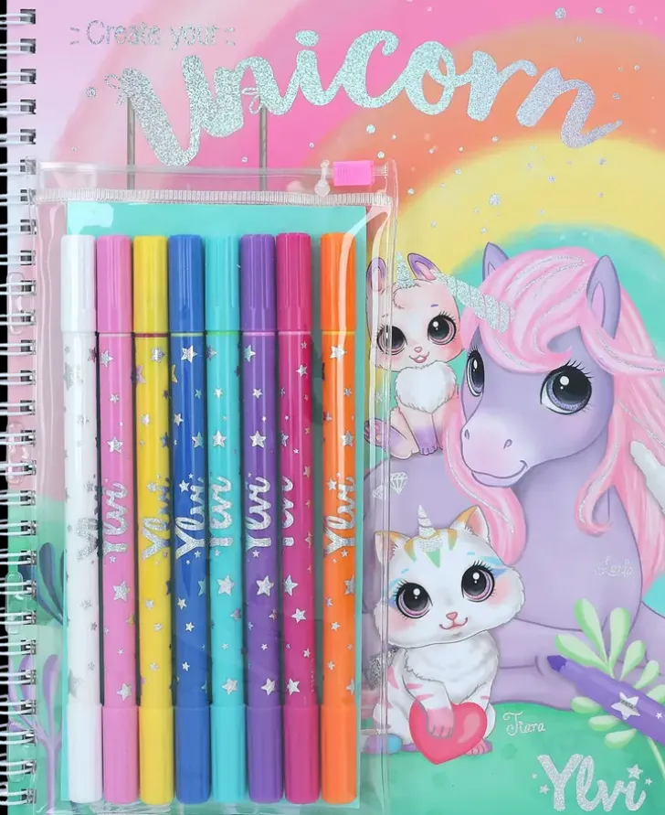 Taianomaisen Ylvi-Värityskirjan Useilla Sivuilla Seikkailevat Ihanat Yksisarviset. Kirjan Mukana Saat 8 Tussia, Joissa Jokaisessa Sekä Paksumpi Että Ohuempi Pää. Mukana 7 Eri Väriä Sekä Taikatussi, Jonka Avulla Saat Taiottua Uudet Värit!